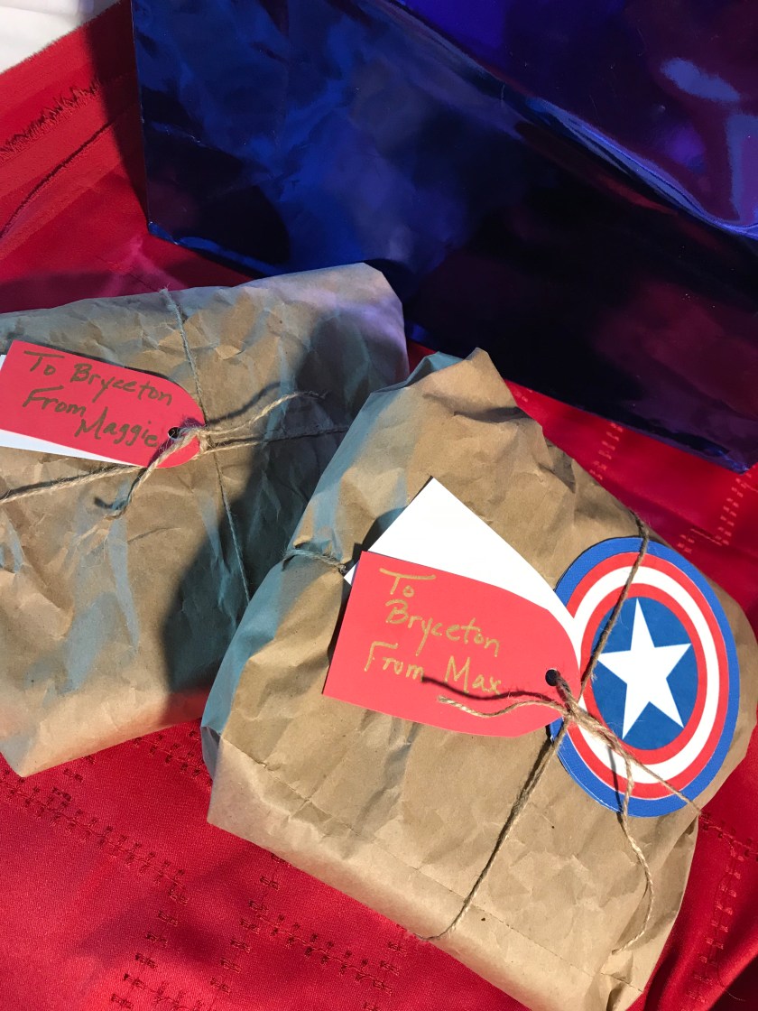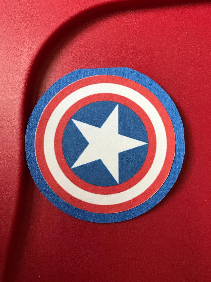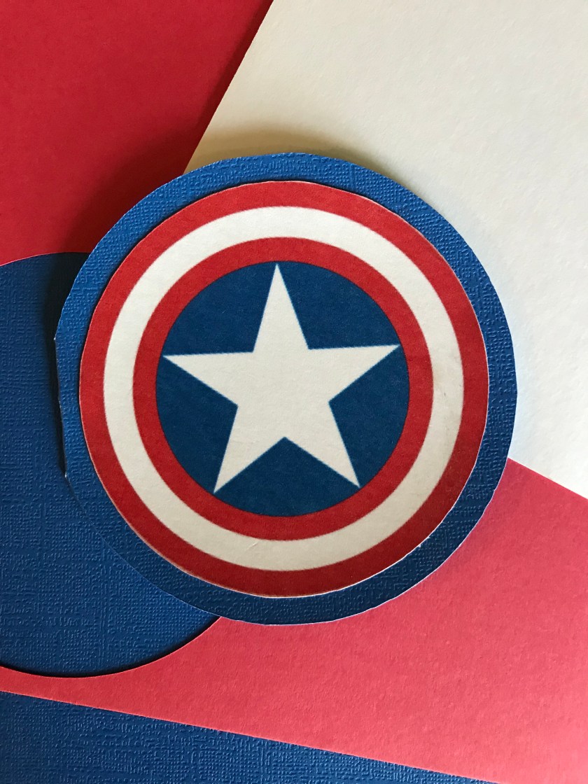 I designed the Captain America shield myself. Since it is just concentric circles and a star, it was the easiest one to create. I used print and cut on my machine to make that part. The rest was just cutting. I hand-lettered the inside on a red circle but you can, of course, use your machine to do that, too.